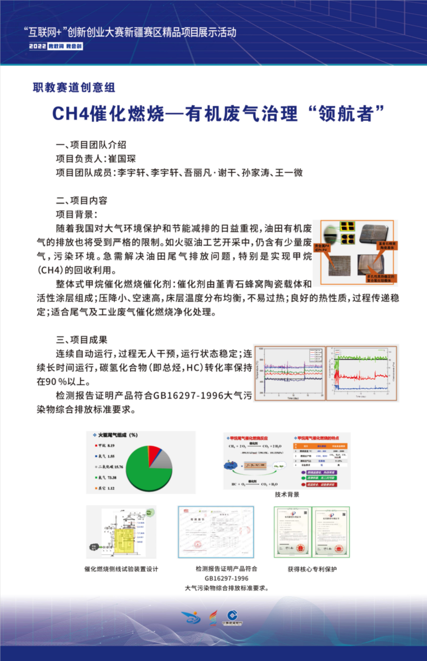 在刚刚结束的第八届中国国际“互联网+”大学生创新创业大赛新疆赛区总决赛中,我校石油与化学工程学院李国峰老师团队《CH4催化燃烧—有机废气治理领航者》项目斩获新疆赛区职教赛道创意组金奖,首次实现了澳门网投在该比赛中金奖零的突破。该项目核心团队成员均为石油与化学工程学院不同专业大一、大二学生,他们优势互补、团结合作。团队按照学院的备赛安排,经过将近一年的准备时间,历经多轮训练打磨和30余次的修改完善,最终获得自治区金奖。