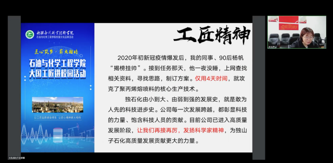 9月30日,石油与化学工程学院举办第一期匠心筑梦·薪火相传——大国工匠进校园活动。来自中国石油独山子石化公司首席技术专家、自治区劳动模范、教授级高级工程师宋玉萍以“板凳干坐十年冷”为题讲述技能传承、劳动成才的故事。