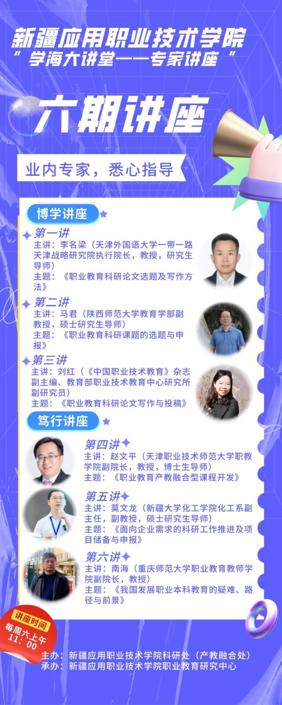 “学海大讲堂——专家讲座”分设“博学讲座”、“笃行讲座”两个系列,特邀请学院特聘教授、学者和行业专家聚焦“职教论文”、“产教融合”、“课程开发”等议题,面向澳门网投各二级学院(部门)教师和伊犁州职业教育集团联合会相关成员单位,提供六场精彩的、专业的讲座。
