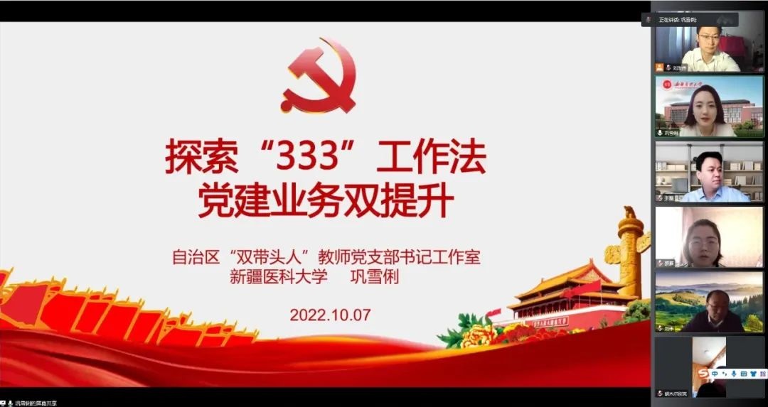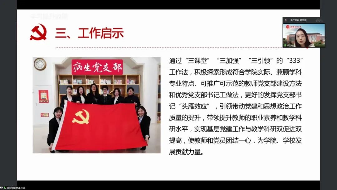 学院邀请新疆医科大学基础医学院病理生理学党支部书记 巩雪俐作《探索“333”工作法党建业务双提升》的专题培训。巩雪俐书记以“三课堂”“三加强”“三引领”为重点内容,分享了作为“双带头人”党支部书记开展党建业务深度融合发展的工作方法和体会,使澳门网投党务工作者进一步拓宽视野、理清思路,为“双带头人”教师党支部书记培育、样板党支部建设、党建品牌建设等工作指明了方向。