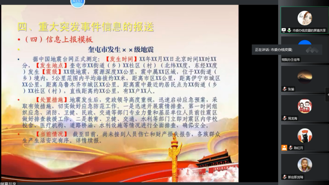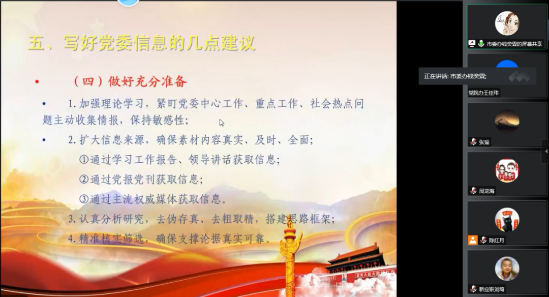 本次系列培训采用线上直播形式开展,组织教师集中收看学习。本期培训由奎屯市委办钱奕霖科长以“关于做好新时代党委信息工作的几点看法”为主题进行授课,从党委信息的定位、党委信息的报送重点、撰写上报需要把握的关键点、重大突发事件信息的报送、写好党委信息的几点建议等五个方面,列举大量生动详实的工作案例,详细讲述了撰写党委信息工作中存在的问题。