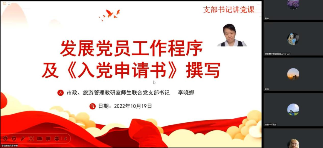 10月19日,园林与旅游管理学院旅游管理与市政教研室师生联合党支部在线上开展“支部书记讲党课”活动。由“双带头人”党支部书记向22级新生中的共青团员,作了题为《发展党员工作程序及〈入党申请书〉撰写》的专题党课,活动的开展极大地促进了党建带团建走深、走实,也坚定了共青团员入党的决心和信心。