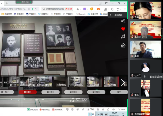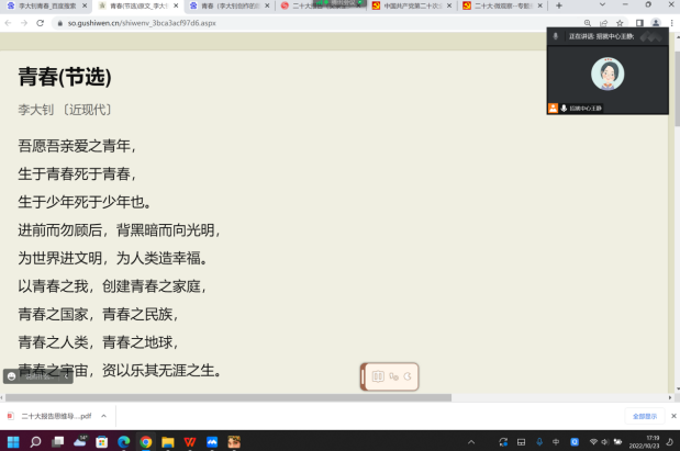 各党组织通过线上形式,组织党员师生分享诵读红色经典故事、诗歌,感悟红色经典,汲取奋进力量。招就中心、财务处、保卫处联合党支部集体诵读了李大钊同志散文《青春》节选,党员干部用饱含深情的诵读,将大家的思绪带回到那个战火纷飞的年代,纷纷表示要继续展现昂扬向上的精神面貌,奋力开创工作新局面。师范教育学院党员教师朗诵的诗歌《十月》,饱含深情地赞颂了祖国翻天覆地的变化,歌颂了祖国的日益强大,同时也激发了党员教师为祖国建设拼搏奋斗的决心。