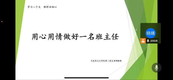 各党组织邀请学院在第三十八个教师节中选树表彰的先进教师代表,开展榜样话初心,经验分享活动。马克思主义学院党总支邀请本年度“优秀班主任”胡晓晴老师,为大家讲述她在师德师风建设、教育教学、班主任工作、学生管理等方面的先进经验和奋斗故事,以此激励大家向身边先进典型学习,积极投身教育事业,落实立德树人根本任务。