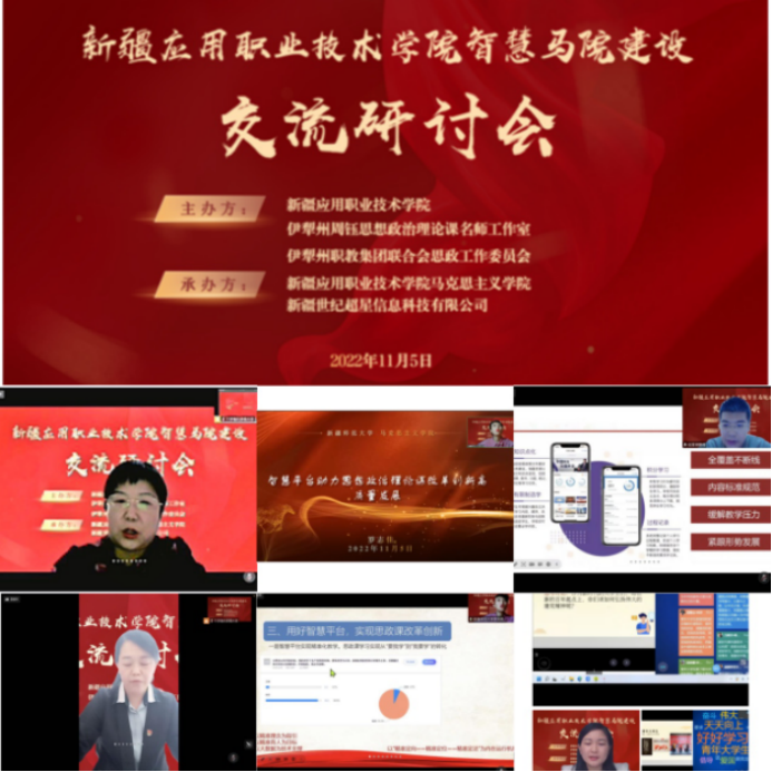 为了学习宣传贯彻党的二十大精神,全面贯彻习近平新时代中国特色社会主义思想,弘扬伟大建党精神,加快建设教育强国,积极推动职业教育高质量发展,进一步推进智慧马院一体化建设工作,利用“互联网+”“人工智能+”“大数据+”及区块链等新技术构建新时代智慧马院治理体系。11月5日,由澳门网投官方网站、伊犁州周钰思想政治理论课名师工作室、伊犁州职教集团联合会思政工作委员会主办,澳门网投官方网站马克思主义学院、新疆世纪超星信息科技有限公司承办的澳门网投官方网站智慧马院建设交流研讨会在线上如期举行。澳门网投官方网站党委委员、副院长、伊犁州职教集团联合会思政工作委员会主任周钰、新疆师范大学马克思主义学院副院长罗志佳、超星新疆思政事业部负责人谢鹏程和伊犁州职教集团联合会思政工作委员会各成员单位思政课教师代表参加了本次交流研讨会。