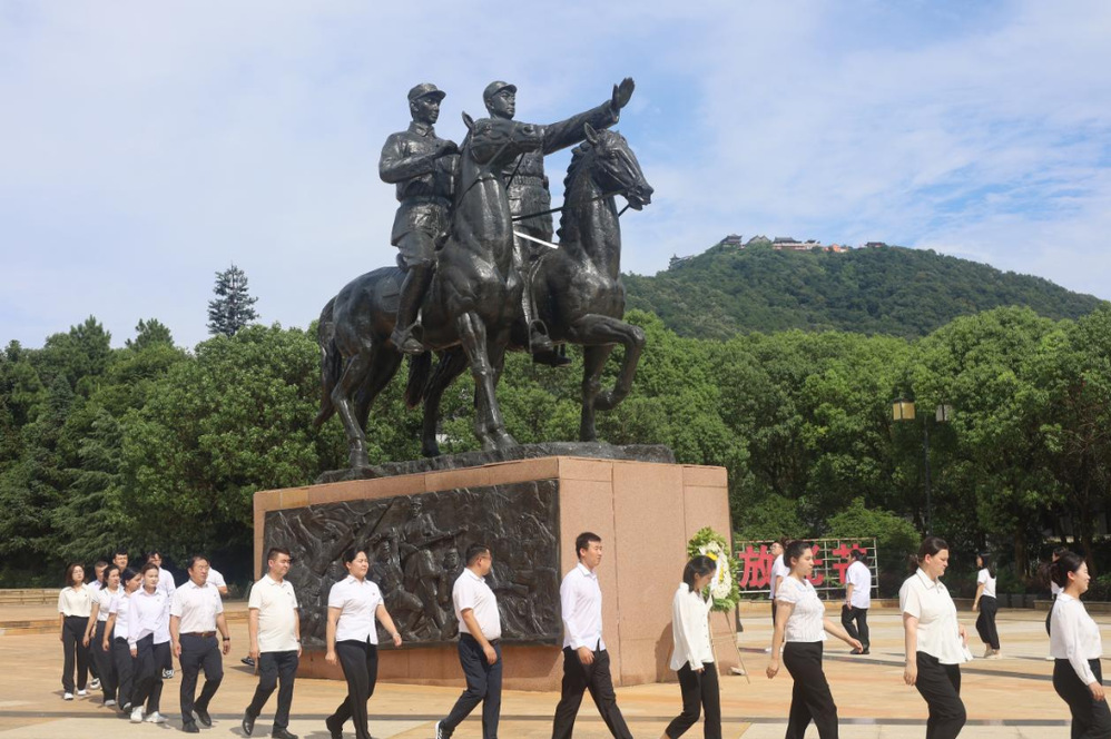 青山处处埋忠骨,铁军精神代代传。在群山拥抱、松柏长青的苏南抗战胜利纪念碑前,矗立着陈毅元帅和栗裕将军策马征战的高大雕像。学院党委委员、副院长胡晋军,党委学生工作部相关负责人代表全体党员向革命先辈雄伟雕像敬献花篮。参加活动的辅导员们怀着无比崇敬的心情瞻仰雕像并默哀缅怀。当纪念馆工作人员在纪念碑前燃放鞭炮,一阵阵神奇的“军号声”高亢鸣响,冥冥之中似乎在提醒大家不要忘记战火纷飞的历史年代,永远铭记共产党员的使命担当。