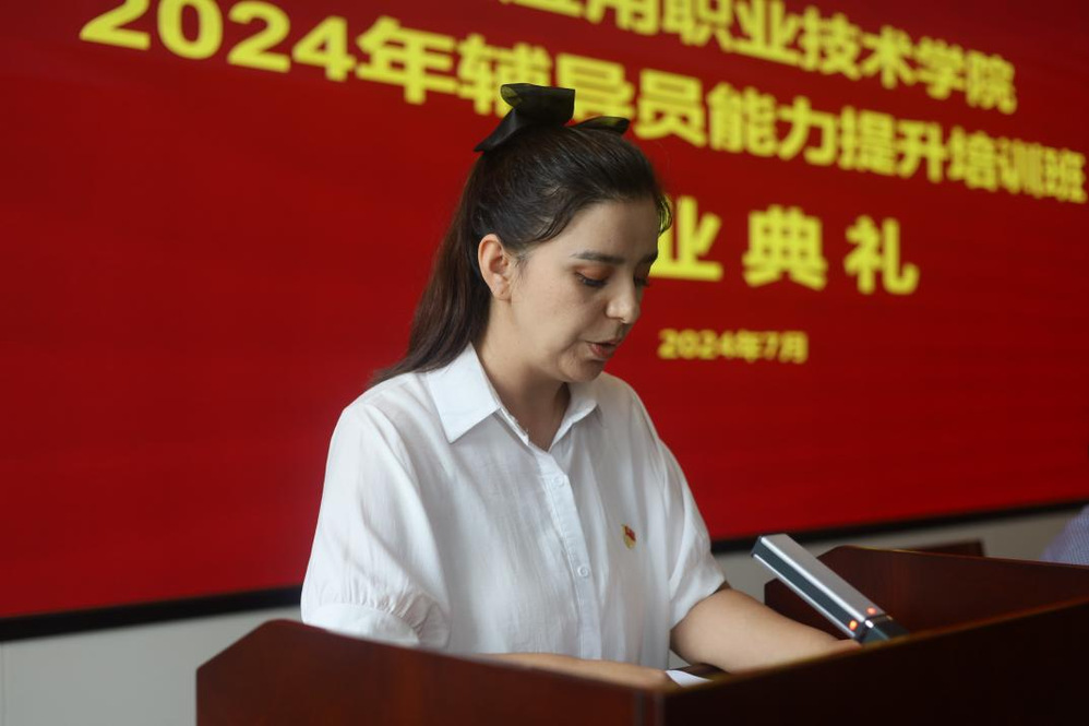 优秀学员代表苏比亚·阿巴斯进行发言:“感谢江苏农林职业技术学院为我们精心策划丰富生动的培训课程,在辅导员队伍建设、高校一站式学生社区综合服务管理模式、学生心理健康教育、创新创业教育与实践指导和学生资助工作等方面结合专题讲座、交流研讨、实地参访等多样形式,为我们带来了一场暑期研修提升的学习大餐,让我们在最短的时间内汲取到了最多的养分,受益颇多。”