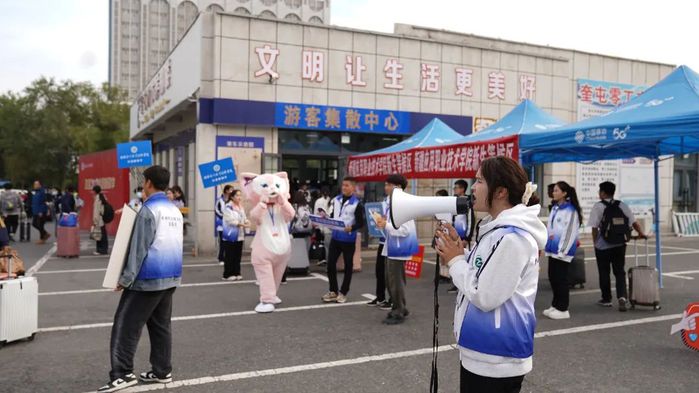 经过11日的迎新情况,各点位的工作人员快速投入到工作中,大家各司其职,通力合作、细化服务、落 实职责。无论是在车站中的新生接待点还是在校门口,处处都能看到醒目的迎新指引。