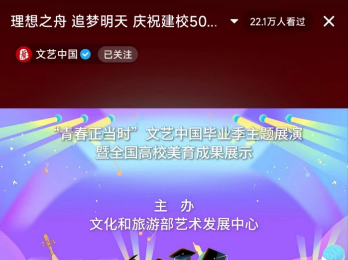 近日,在文化和旅游部艺术司指导、文化和旅游部艺术发展中心主办的首届“青春正当时”文艺中国毕业季主题展演暨全国高校美育成果展示活动中,我校选送的《“理想之舟·追梦明天”庆祝建校50周年暨2024年毕业生晚会》入选展演!是新疆众多高校中唯一入选的学校。并在首届“青春正当时”文艺中国毕业季主题展演暨全国高校美育成果展示活动中直播人数达45万人!