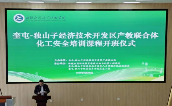 为深入贯彻落实现代职业教育体系建设改革要求,紧扣“教育链、人才链与产业链、创新链深度融合”的改革方向,3月28日,由奎屯-独山子经济技术开发区产教联合体主办,学院石油与化学工程学院承办的“奎屯-独山子经济技术开发区产教联合体化工安全培训课程”正式举办。开班仪式上,经开区人就局、环安局、学院科研处(产教融合处、教育质量评估中心)、石油与化学工程学院相关领导及区域11家重点化工企业相关负责同志参加。