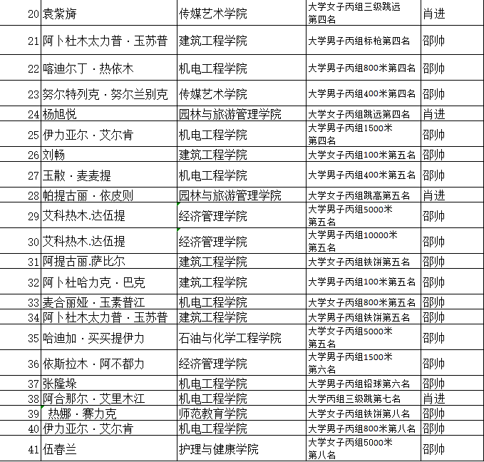赛前教练组提出了应职速度、应职高度,应职力量的参赛口号,面对比赛备赛充分,运动员信心十足。在比赛中,学院共有五名运动员成绩达国家二级运动员水平。通识学院肖进老师、邵帅老师荣获“优秀教练员”称号,阿亚拉·吐尔逊阿力、甫肉孜亚·麦合莫提同学荣获“优秀运动员”称号。
