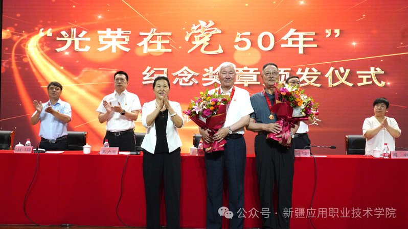 学院党委书记陈梅兰为阿布代西·努尔斯拉木、王启兴2名老党员颁发纪念章。当沉甸甸的金色纪念章挂在老党员胸前时,会场响起经久不息的掌声,五角星、镰刀锤子等图案勾勒出半个世纪的信仰坚守。