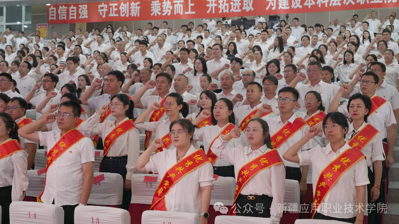大会在雄壮的国歌声中拉开帷幕。在学院党委书记陈梅兰的带领下,全体党员高举右拳,面向党旗重温入党誓词,铿锵誓言响彻会场,彰显着对党忠诚的政治本色。与此同时,新入党的党员们也庄严地站在队列中,紧握右拳,逐句宣誓。“我志愿加入中国共产党,拥护党的纲领,遵守党的章程……”坚定的声音与老党员们厚重有力的誓言交织在一起,在会场上空久久回荡。这不仅是对新党员政治生命的一次洗礼,更是新老党员之间精神信仰的传承与接力,每一个字都承载着对党的无限热爱与为共产主义事业奋斗终身的坚定决心。