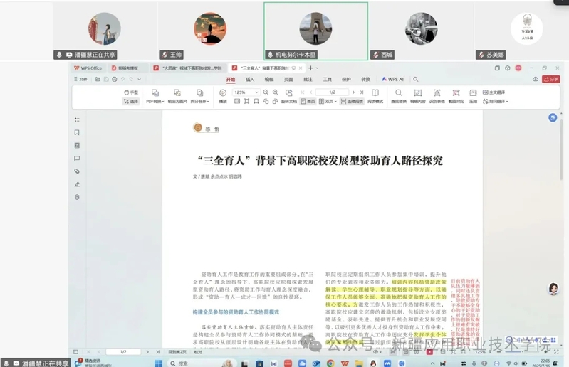 此外,潘疆慧老师还分享了江苏商贸职业学院在“三全育人”背景下的资助育人路径。她强调,资助育人工作需要全员参与、全过程贯穿、全方位覆盖,通过构建四级资助管理体系、加强思想政治教育、完善学业帮扶指导等方式,形成“资助—育人—成才—回馈”的闭环机制。两篇论文的研究成果为学院进一步优化资助育人工作提供了宝贵的理论依据和实践参考。