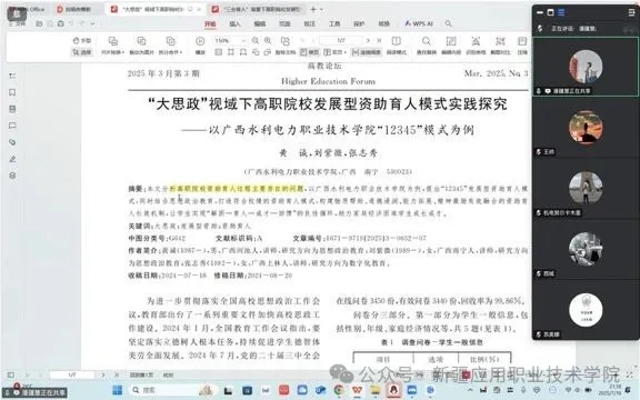 潘疆慧老师结合广西水利电力职业技术学院的“12345”发展型资助育人模式,详细解读了该模式的核心内容。她介绍,“12345”模式以辅导员工作室为引领平台,通过线上线下双线并进的方式,落实精准认定、精准分类、精准资助的要求,构建国家资助、学校奖励、社会捐助、学生自助“四位一体”的资助体系,并实施知识竞赛、榜样提升、阳光心理、感恩教育、创新创业五大育人工程。这一模式不仅解决了传统资助工作中“重资助轻育人”的问题,还实现了从“解困”到“回馈”的良性循环,为家庭经济困难学生的全面发展提供了有力支持。