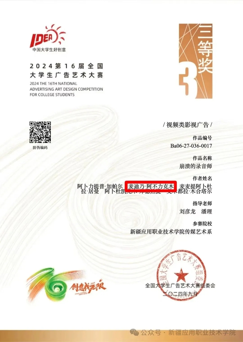 西部计划是由团中央、教育部、财政部、人力资源社会保障部共同组织实施的一项重大人才工程,旨在鼓励青年学子到西部去、到基层去、到祖国最需要的地方去建功立业。此次麦迪乃·阿不力克木成功入选,不仅是个人的荣耀,更是传媒艺术学院的骄傲,充分展现了学院学子勇于担当、积极奉献的精神风貌。