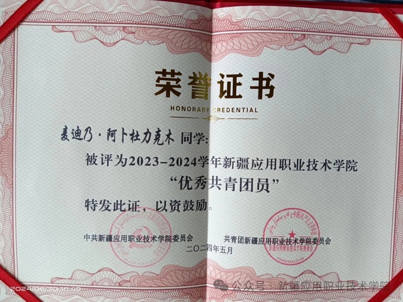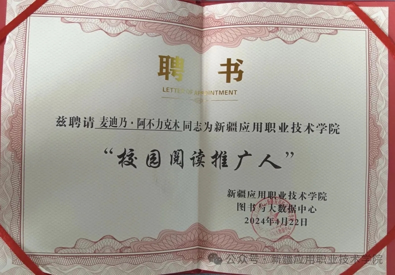 麦迪乃·阿不力克木同学在校期间表现优异,专业成绩名列前茅,曾多次获得奖学金与各类比赛奖项。她积极参与校园活动,在班级担任副班长职务,锻炼了出色的组织与沟通能力。同时,麦迪乃·阿不力克木热衷于志愿服务,把每个寒暑假时间都奉献于村委会志愿者服务当中,在实践中不断践行“奉献、友爱、互助、进步”的志愿精神。谈及入选西部计划的感受,麦迪乃·阿不力克木激动地表示:“一直以来,我都渴望能为祖国发展贡献力量,西部计划给了我这个机会,我将全力以赴,把所学知识运用到工作中,不负青春,不负时代。”
