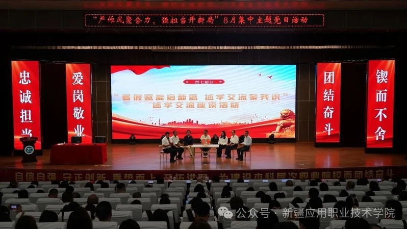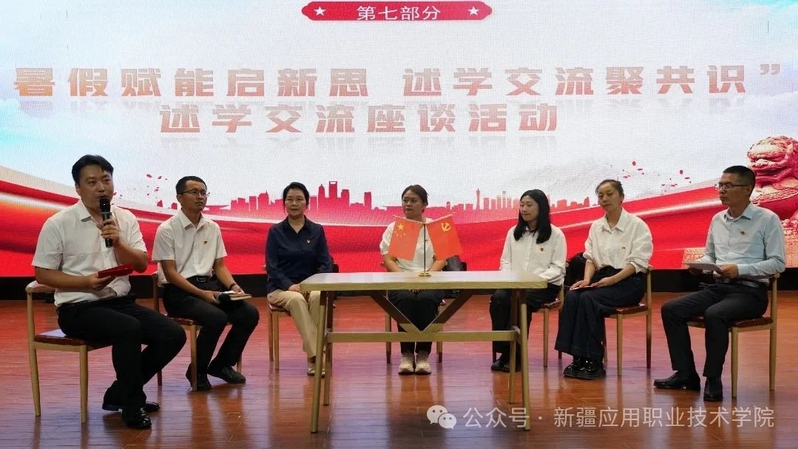 最后,开展“暑假赋能启新思,述学交流聚共识”述学交流座谈活动。师范教育学院党总支书记曹文尧、建筑工程学院援疆专家赵华玮等6位同志,与访谈主持人吕旭鹏一起,围绕暑假学习收获、学院升本创建等内容展开座谈交流。大家的分享既有思想高度,又有实践温度,既回顾了暑期学习与工作的丰硕成果,也勾勒出新学期助力学院发展的清晰路径。座谈现场交流氛围热烈,大家围绕学院升本创建目标,进一步统一了思想、凝聚了共识。大家纷纷表示将以实干担当推进党的建设、教育教学、学生管理、安全稳定、援疆等工作,为学院高质量发展贡献力量。