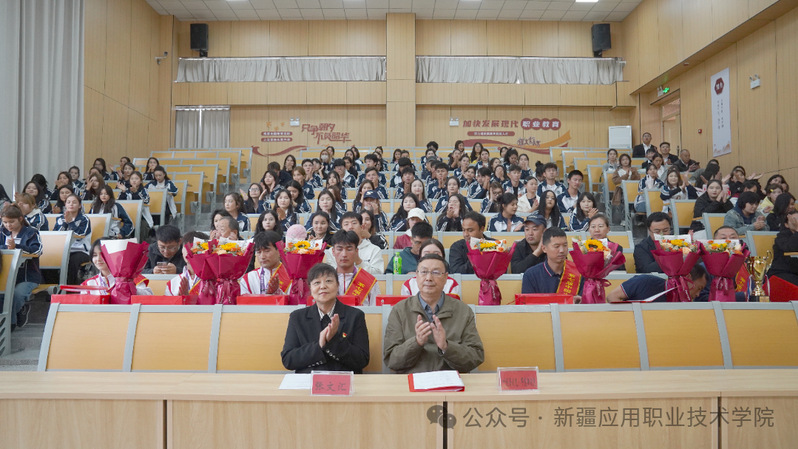 庆功仪式进入了最激动人心的环节,学院党委副书记、院长叶列吾别克·那克斯别克,学院党委委员、科研处处长张文汇为援疆专家陈广旭教授、冠军教练康志武老师和王凯老师及冠军队员们披上绶带、送上鲜花和礼品。