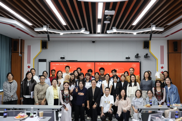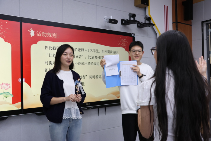 讲座之后,“飞花令诗词接龙”与“你比我猜”互动环节将现场氛围推向了高潮。飞花令围绕“中秋”“月”“团圆”三大关键词展开,师生们依次进行30秒限时接龙挑战,这不仅考验了大家的诗词储备,更让师生们在互动中重温了传统文学之美。“你比我猜”环节则以“教师+学生”组队的形式进行,比划者通过动作与语言提示,让猜词者猜出 “月饼”“玉兔”“嫦娥奔月”等中秋主题词汇及社会主义”“中国精神”“共同富裕”等专有名词,思政育人“润物细无声”,师生协作间拉近了彼此的距离,节日氛围愈发浓厚,又一次践行了马克思主义学院“一马当先 幸福党建”的党建品牌理念。