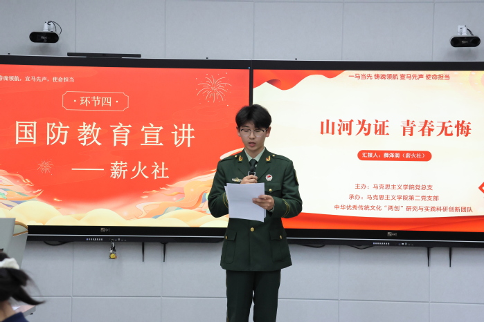 在思想引领环节,多社团联动开展主题宣讲,聚焦家国情怀与责任担当。薪火社团带来了以《山河为证,青春无悔》为主题的国防教育宣讲,石榴籽宣讲团围绕《新时代党的治疆方略的成功实践》白皮书,深入解读新疆发展成果,引导师生坚定“五个认同”。