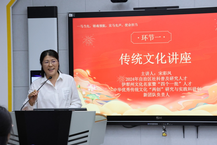 活动伊始,马克思主义学院党总支书记刘春艳为本次活动致开幕词。随后,哈萨克族舞蹈《毡房星辉》闪亮登场,瞬间点燃了现场的节日氛围,师生们在欢快的舞蹈中开启了赏析中华优秀传统文化之旅。接着,2024年度新疆社会科学普及研究人才宋彩凤教授带来了题为《边关明月照丹心——西域中秋诗中的爱国情怀》的知识讲座。宋教授引领师生们在“明月出天山,苍茫云海间”等经典诗句中遨游,深刻感受中华优秀传统文化与爱国精神的深度交融,为现场师生奉献了一场兼具学术性与感染力的文化盛宴。