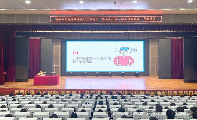 为强化2025级新生法治观念与网络安全意识,园林与旅游管理学院开展“法治进校园——防范网络诈骗”专题讲座,特邀学院派出所民警方祥主讲,全体新生参会。