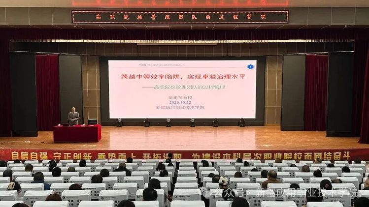 为深入贯彻落实新时代高职院校治理要求,着力破解管理效能提升难题,加快推进学院治理体系与治理能力现代化进程。10月22日,学院特邀南京航空航天大学管理科学与工程专业博士生导师苗建军教授来学院开展“跨越中等效率陷阱,实现卓越治理水平——高职院校管理团队的过程管理”专题学术讲座。讲座由学院副院长(援疆)孔祥静主持,学院党委班子成员、各职能部门教职工及教师代表参加学习。