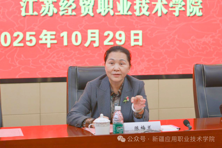学院党委书记陈梅兰对江苏经贸职业技术学院的大力支持表示衷心感谢,指出两校合作前景广阔,希望能够加强各领域的合作,巩固教育援疆成果,助力双方在教育援疆框架下实现合作共赢,共同谋划升本蓝图。