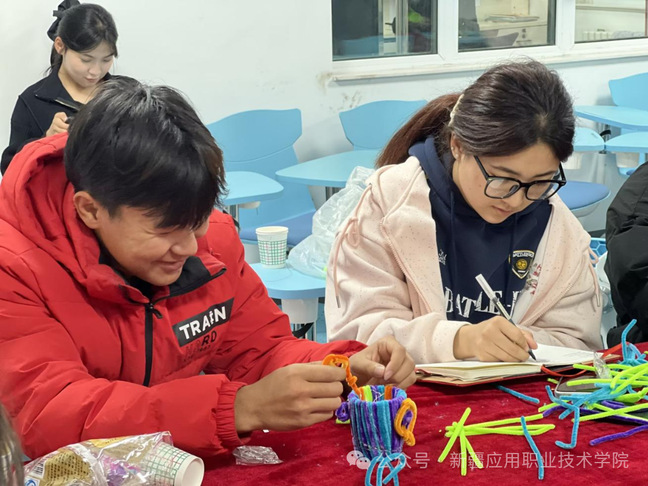 活动过程中,学生们充分发挥机电专业的动手能力与创新思维,有的独自专注创作,将对“机械美学”的理解融入手工设计;有的组队协作,在交流互动中分享创作灵感与生活趣事。电气自动化技术25101班的马同学拿着自己制作的“笔筒”兴奋地说:“平时专业课学习压力不小,今天捏扭扭棒的时候特别放松,看着零散的材料变成完整的作品,特别有成就感,还认识了几个志同道合的朋友。”
