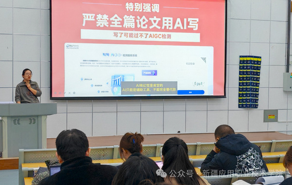 讲座的最后环节,开展了互动讨论。主讲人耐心解答了师生提出的在科研工作中使用AI大模型遇到的相关问题,分享了科研实用工具指南、AIGC检测避坑指南和PaperYY、OurTeacher等小程序,提醒师生严禁AI代写论文,严守学术诚信。