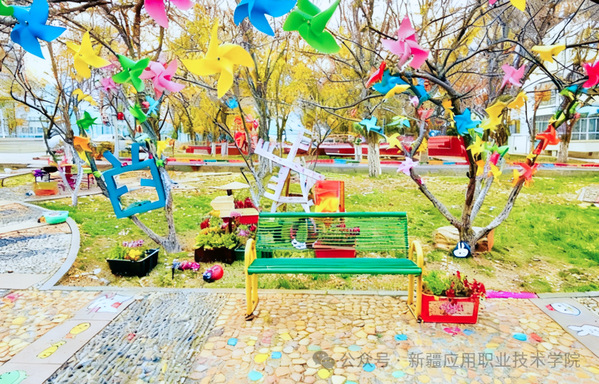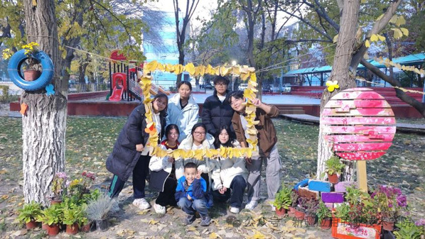 在海纳尔社区的一处闲置角落,学生与居民一起打造了融合新疆本土植物与休闲功能的花园空间。学生们手把手教社区老人辨识耐旱、耐寒的本土花卉,带着小朋友用彩色石子铺设创意路径;另一处针对儿童活动区的地块,第二小队设计了“童趣自然乐园”,设置植物认知角、迷你种植箱,让孩子们在观察花草生长中亲近自然。