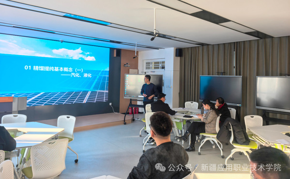 新进教师吴鹏钊围绕《硅产业概论》“硅提纯章节”展开教学,聚焦“硅材料与新能源产业发展”的关联点。他从“光伏硅料提纯技术难点”入手,结合我国在光伏新能源领域的全球领先地位,讲解硅提纯技术对推动“双碳”目标实现的关键作用;同时,通过介绍新疆本地硅产业园区的发展现状与人才需求,引导学生将个人专业学习与区域产业发展、国家能源战略相结合,激发学生的专业认同感与学习动力。