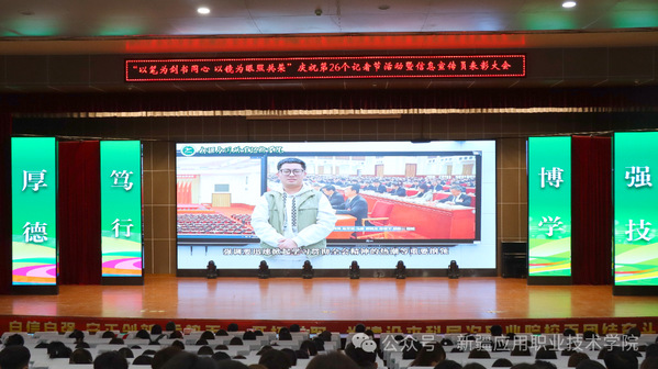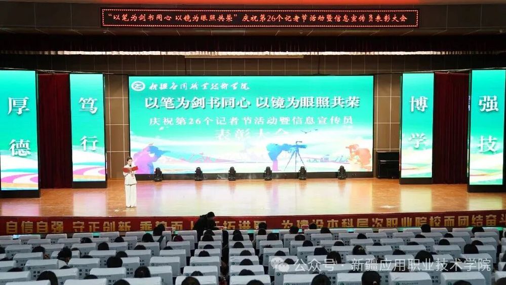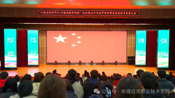 在这个充满希望和收获的季节里,主校区北院学术报告厅内灯光璀璨、氛围热烈。学院“以笔为剑书同心 以镜为眼照共荣”庆祝第26个中国记者节活动暨信息宣传员表彰大会在此举行,学院党委委员、宣传部部长卡吾孜亚提·斯德克,相关部门负责人、各二级学院宣传委员,以及信息宣传员、融媒体中心社团成员等师生代表齐聚一堂,共庆属于信息宣传工作者的专属节日。