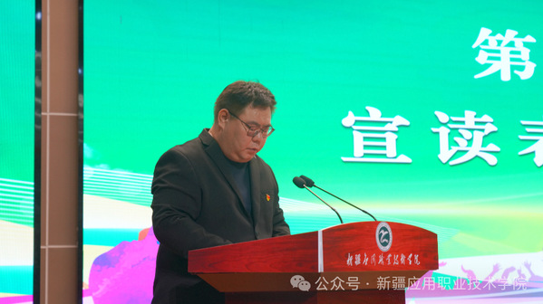 图为 学院党委宣传部融媒体中心主任塔斯肯宣读相关文件