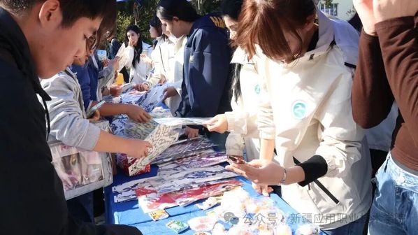 新疆民俗展作为两校学子交流的开篇序曲,宛如通往西域的瑰丽窗口:缀满艾德莱斯丝绸纹样的包包与围巾,经纬间满是新疆儿女的热忱;印刻喀纳斯湖光、天池晨雾的明信片,将边疆美景定格成可触摸的思念;造型别致的特色冰箱贴,以小巧设计承载民俗记忆,成为传情暖心信物。