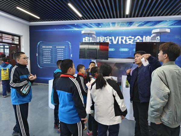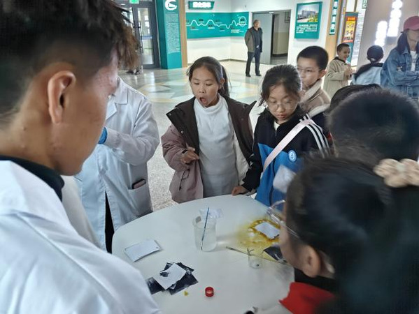 四大专业志愿者化身“科普导师”:石油化工技术学子展示“石油的绿色旅行”模拟实验,环境工程技术学子开展“污水变清”小实验,化工生物技术学子用环保材料制作趣味模型、绿色化工VR体验等互动环节,将专业知识转化为科普语言,累计吸引五十余名儿童参与,在孩童心中播下绿色科技的种子。