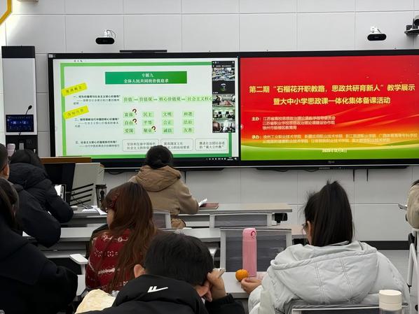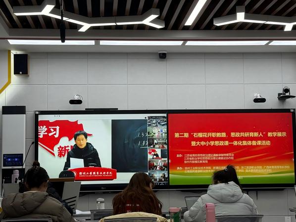 为深入贯彻习近平总书记关于思政课建设的重要指示精神,统筹推进大中小学思政课一体化建设,切实发挥思政课立德树人关键作用,近日,第二期“石榴花开职教路,思政共研育新人”教学展示暨大中小学思政课一体化集体备课活动顺利举行。本次活动由江苏省高校思想政治理论课教指委高职高专分教指委、江苏省职业学校思想政治理论课建设协作组(苏北片区)及徐州市鼓楼区教育局联合主办。马克思主义学院全体教师线上参与,与各地教育同仁共探思政育人新路径。