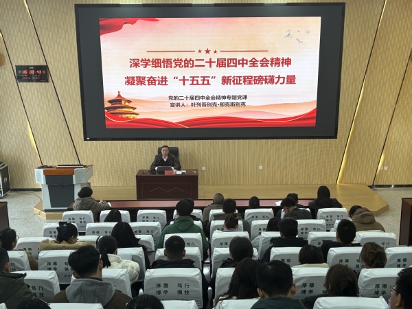 学院党委副书记、院长叶列吾别克·那克斯别克紧扣党的二十届四中全会精神的核心要义,结合国家发展大局与职业教育实际,从“党的二十届四中全会精神的内涵是什么”、“‘十四五’时期的辉煌成就与职业教育的积极贡献”和“‘十五五’宏伟蓝图中职业教育的使命与行动”等方面进行了系统阐释和深入解读。