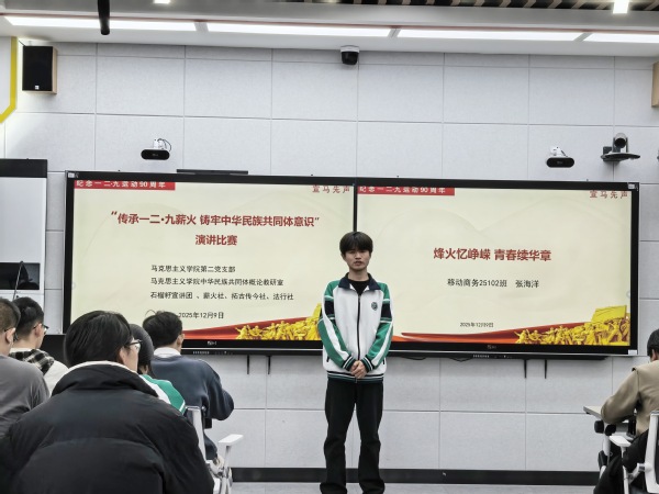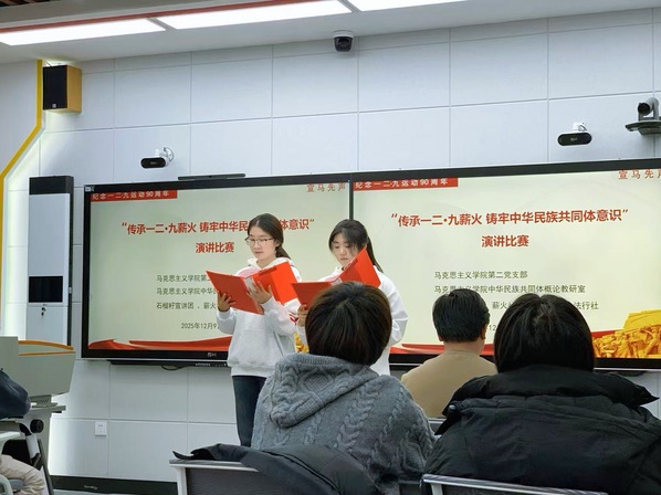 为纪念“一二·九”抗日爱国运动爆发90周年,引导学生深入了解历史事件,缅怀革命先烈,激发爱国情怀。在马克思主义学院第二党支部“宣马先声”党建品牌的引领下,中华民族共同体概论教研室结合《中华民族共同体概论》和《中国近现代史纲要》教学内容,依托“我们的节日、纪念日”实践教学品牌,特此开展传承“一二·九”薪火铸牢中华民族共同体意识演讲比赛。