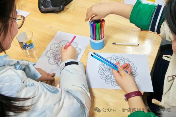 创作环节中,同学们手持彩笔,从中心图案出发自由延展。有人用规整的线条勾勒对称美学,在秩序感中安抚躁动的思绪;有人以大胆的撞色释放内心活力,让压抑的情绪随色彩流淌;现场没有喧嚣,只有笔尖与画纸摩擦的沙沙声,每一笔都是思绪的梳理,每一抹色彩都是情绪的安放。