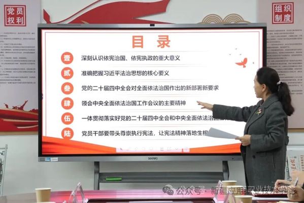 学院党委书记陈梅兰以“坚持旗帜引领 弘扬宪法精神 开创新时代法治新疆建设新局面”为题,进行专题宣讲,并围绕依宪治国、依宪执政的重大意义等六个方面,系统阐述了宪法作为国家根本大法的地位、作用与精神内涵。她强调党员干部应带头尊崇宪法、严格执行宪法,号召全体师生自觉成为宪法的忠实崇尚者、自觉遵守者和坚定捍卫者。
