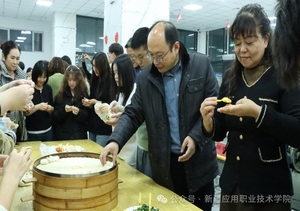 艺术学院邀请学院党委委员、宣传部部长卡吾孜亚提·斯德克,学院党委委员、纪委书记李卫华,学院党委学生工作部全体教职工,艺术学院全体教职工与学生齐聚一堂,共庆佳节、共叙情谊。活动现场暖意融融,餐桌上饺子皮、馅料及各类工具一应俱全。师生们自由组队,热情高涨地投入到包饺子环节中。老师们手法娴熟,一边包饺子一边分享着自己的经验,师生们围坐一堂,相互传达着真诚又温馨的寄语与祝福,一句句真挚的话语,如同冬日里的暖阳,温暖着每个人的心房,也为此次活动画上了圆满的句号。