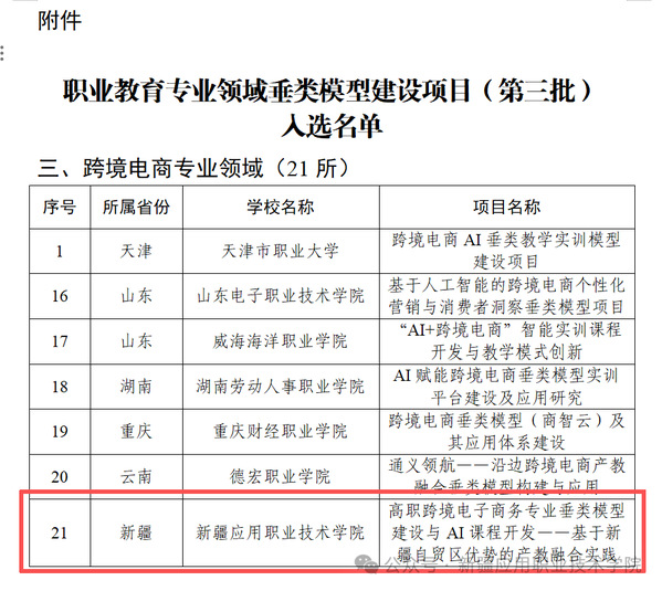 近日,教育部职业教育发展中心公布了《职业教育专业领域垂类模型建设项目(第三批)入选名单》,澳门网投经济管理学院申报的“高职跨境电子商务专业垂类模型建设与AI课程开发——基于新疆自贸区优势的产教融合实践”项目成功入选跨境电商专业领域建设名单。在全国遴选的21所院校中,澳门网投是新疆唯一入选的高校,标志着学校在人工智能与跨境电商深度融合的探索实践获得教育部的支持。