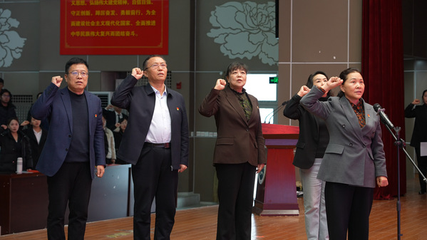 活动以“党建引领申本攻坚,铸牢中华民族共同体意识”为核心,设置七大议程层层递进、环环相扣。在学院党委书记陈梅兰的领誓下,全体党员举起右拳重温入党誓词,铿锵誓言回荡全场,既是对初心使命的再检视,更是对“申本”攻坚责任的再强化。集体诵读《中国共产党章程》第一章,让党员们在逐字逐句中深化对党的根本行为规范的理解,筑牢尊崇党章、践行党章的思想根基。