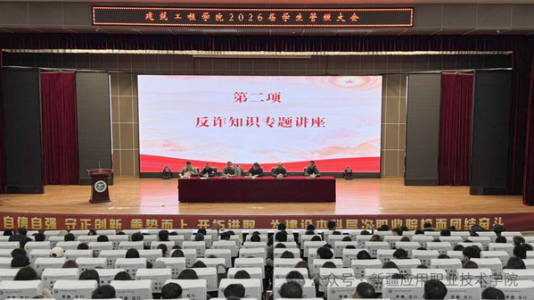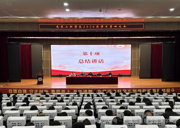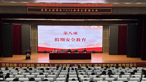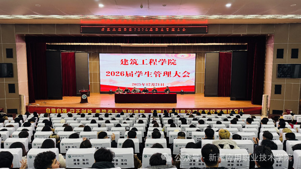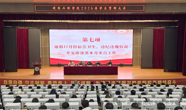 为加强学生教育管理,树立先进典型,凝聚奋进力量,做好2026届毕业生教育管理服务工作。2025年12月21日,建筑工程学院在主校区北院学术报告厅召开2026届学生管理大会。建筑工程学院班子成员,2026届毕业班辅导员、班主任及全体学生参会。